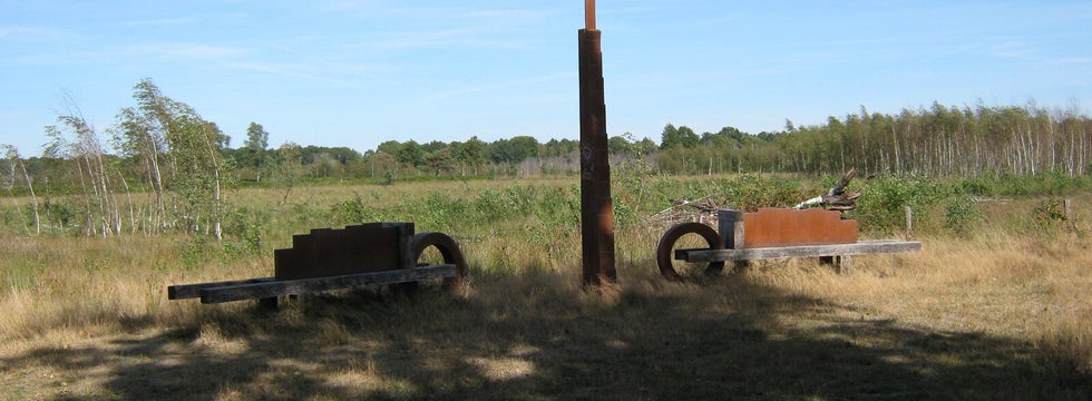Na de lunch maak ik nog effe een rondje door de vesting om die bunkers, de types S G en B kazematten eens van dichtbij te gaan bekijken. Je kunt je niet goed voorstellen hoe het was om hier met een man of dertig in te schuilen voor vijandelijk vuur maar prettig lijkt me dat dus niet echt. Zeker als een vliegtuig het voor mekaar kreeg om er een bom op te gooien want dan had je aan zo'n bunker volgens mij dus helemaal niks. Op dit rondje heb je een prachtig uitzicht over het omliggende heide gebied zeker nu de zon zo uitbundig schijnt. Ook bekijk ik de Peeltroef (die twee kruiwagens op bovenstaande foto). Er staat een beschrijvingsbord bij wat verteld over de geschiedenis van de Peel met als rode draad turf oorlog en hoogveen. Het kunstwerk is van Dirk Verberne een kunstenaar afkomstig uit de Peel