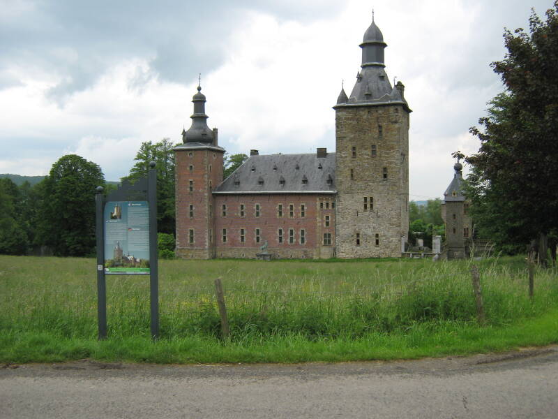 Na Kuchelscheid en Monschau, waar je niets van ziet, naar Mutzenich om bij Atschi's Imbiss pommes met bock wurst als lunch te gaan eten. Ik weet op zeker dat ik verder niet veel gelegenheden meer tegenkom om te lunchen dus doe ik dat hier. Zo vlieg ik wat later als een dolle met 50 km. per uur bergaf naar Roetgen. Moet ook wel want de regen komt ondertussen met bakken naar beneden. Hier toch maar even schuilen want ik heb er een schijthekel aan om met een regenbroek aan te moeten fietsen. Die hoef ik dus nog steeds niet aan gelukkig. Na het laatste stuk van de Vennbahn sla ik bij Raeren linksaf om de Voerstreek weer in te duiken. Eynatten, Hauset, Moresnet en Sippenacken, wat een mooie omgeving hier zeg en ik moet zeggen goede fietswegen en ravels. In Moresnet moet bovenop de berg nog een verlaten klooster liggen. Ik heb het gevonden maar het was zonde van de tijd. Niks aan een troosteloze, verlaten bende benieuwd of ze dit nog ooit op gaan knappen. Wel een mooi stuk door de rimboe langs een mooie visvijver gefietst haha. Een eindje verder sla ik rechtsaf een ravel route op die loopt naast het riviertje de Geul. Ik denk nou dat beloofd wat maar dat viel mee goed en droog te fietsen. Na wat sluip door kruip door weggetjes kom ik langs Kasteel Beusdael dat is tenminste wel mooi. Via een mooie afdaling met uitzicht door het Geuldal kom ik door het plaatsje Sinnich. Verderop in Slenaken bij IJsboerderij de Helenahoeve is het tijd om plan de campagne voor de nacht te gaan maken. Ik zit al tegen de 100 km. het is al 4 uur geweest en veel verder wil ik vandaag eigenlijk niet meer gaan fietsen. Vakantieboerderij Bruisterbosch waar ik maandag overnacht heb maar eens gebeld. Ze hebben het bakkershuisje nog vrij dus ik heb weer mazzel. De eigenaar zegt ik ben er niet maar het huisje is open en de rest vind je zelf wel ik zie je straks wel. Snel langs de bekende weg naar Margraten gefietst om wat boodschappen te doen en bij de vishandel die voor het gemeentehuis stond heb ik een portie kibbeling gegeten voor de ergste honger. Ben ik weer voorzien van alles wat ik nodig heb voor vandaag. Echt spannend was het niet vandaag maar wel heel erg mooie wegen en weggetjes gereden. Geen echt speciale dingen gezien om wat uitgebreider over te vertellen. Natuurlijk heb ik over de Vennbahn al zo vaak en zoveel vertelt dat dit niet echt interessant meer is.