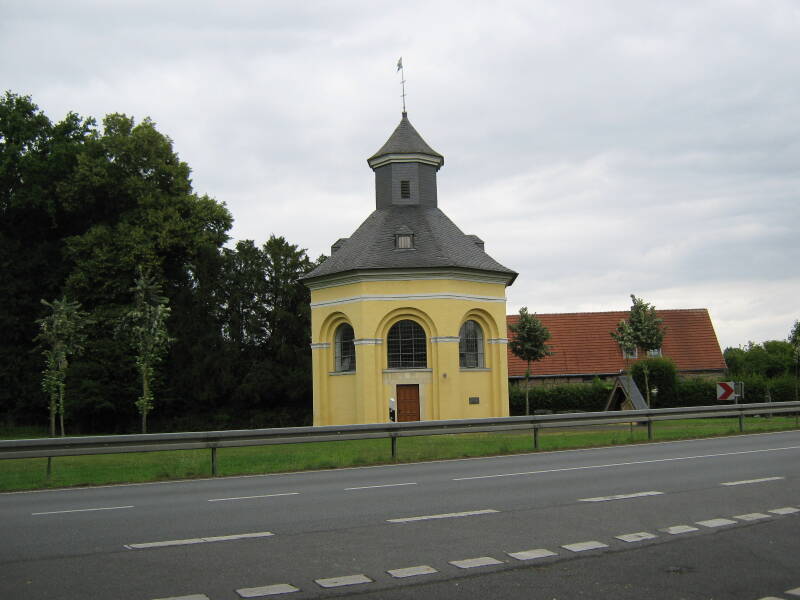 Langs Brungershausen en Eckelshausen kom ik aan in Biedenkopf. De eerste serieuze uitdaging van vandaag gaat beginnen namelijk het dal van de Lahn uitklimmen om in het Edertal te komen. Via Ludwigshutte via Eifa gaat het naar Battenberg. Langs de Bundesstrasse 253 eerst 8 kilometer klimmen aan gemiddeld 8 %. Daarna de lange afdaling het dal van de Eder in naar Battenberg. Niet de mooiste manier om in Battenberg te komen maar met goed in de spiegel kijken en aan de zijkant van de weg blijven fietsen lukt het me toch vrij aardig om dit op een redelijk veilige manier te doen. Ook de auto's houden goed rekening met me en passeren me ruim. In Battenberg eerst maar eens een bakker opgezocht om te lunchen want van die klim en daal gein heb ik aardig honger gekregen. Ik wissel gelijk even de accu voor een verse want na 55 km. klimmen en dalen fiets ik al een tijdje op het laatste blokje dus die zal zo wel helemaal leeg zijn. In Allendorf pik ik vervolgens de Eder Radweg op en gaat het in de richting van de Eder Stausee. Asfalt wegen worden afgewisseld met goed berijdbare kiezelpaden. Het fietst best lekker door zo. Je merkt dat je in een ander dal en langs een andere rivier aan het fietsen bent. De omgeving ziet er hier weer heel anders uit. In Frankenberg maak ik een rondje door het centrum. Ik vind het niks bijzonders en een beetje tijdverspilling maar dat is mijn mening. De route borden zijn ook op de Eder Radweg af en toe helemaal verdwenen en de Garmin begrijpt er ook helemaal niks meer van. Weer een puzzeltocht maar wel een hele leuke. Bij Schmidtlotheim word ik weer linksaf de rimboe ingestuurd maar gelukkig wel op de route en krijg ik net voor de camping nog een verrassing voor de kiezen. De route maakt een haakse bocht naar rechts. Ik stap hier maar af en ga een stukje wandelen. Het gaat langs een heel steil pad naar beneden en na een doorwading door een beekje waar ik zeiknatte voeten van heb gekregen sta ik weer aan de goede kant van de heuvel in het plaatsje Kirchlotheim.